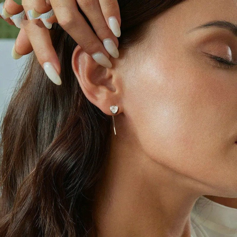 [Description] The heart stud earrings with long pins design delicate and unique. Classic shape of heart make them sweet and charming.